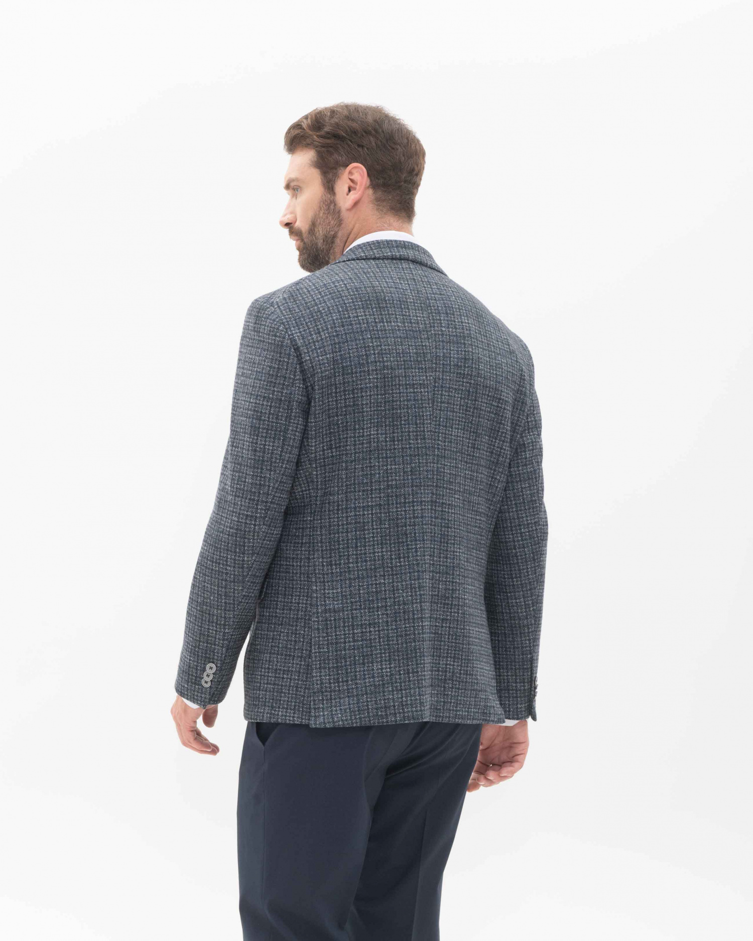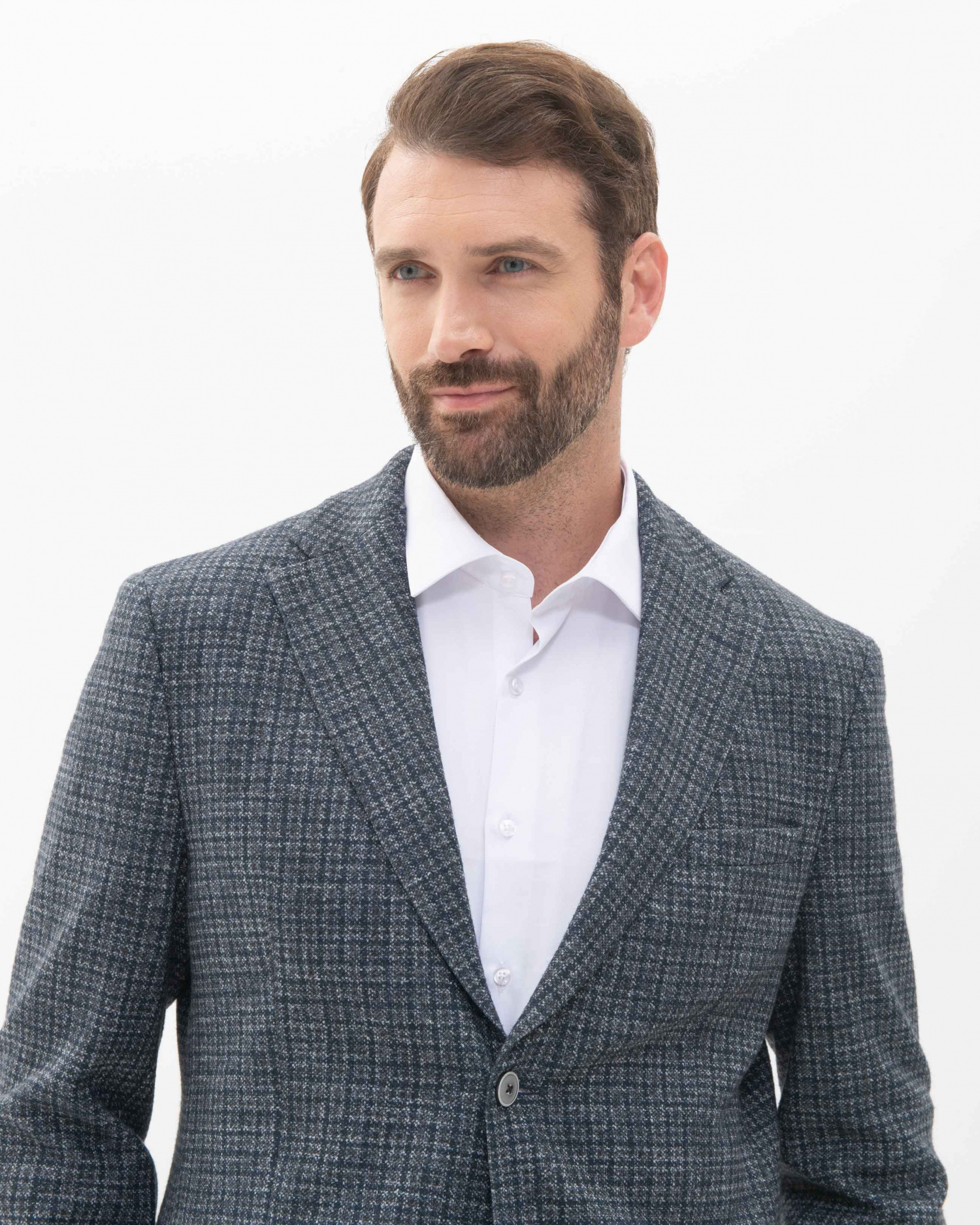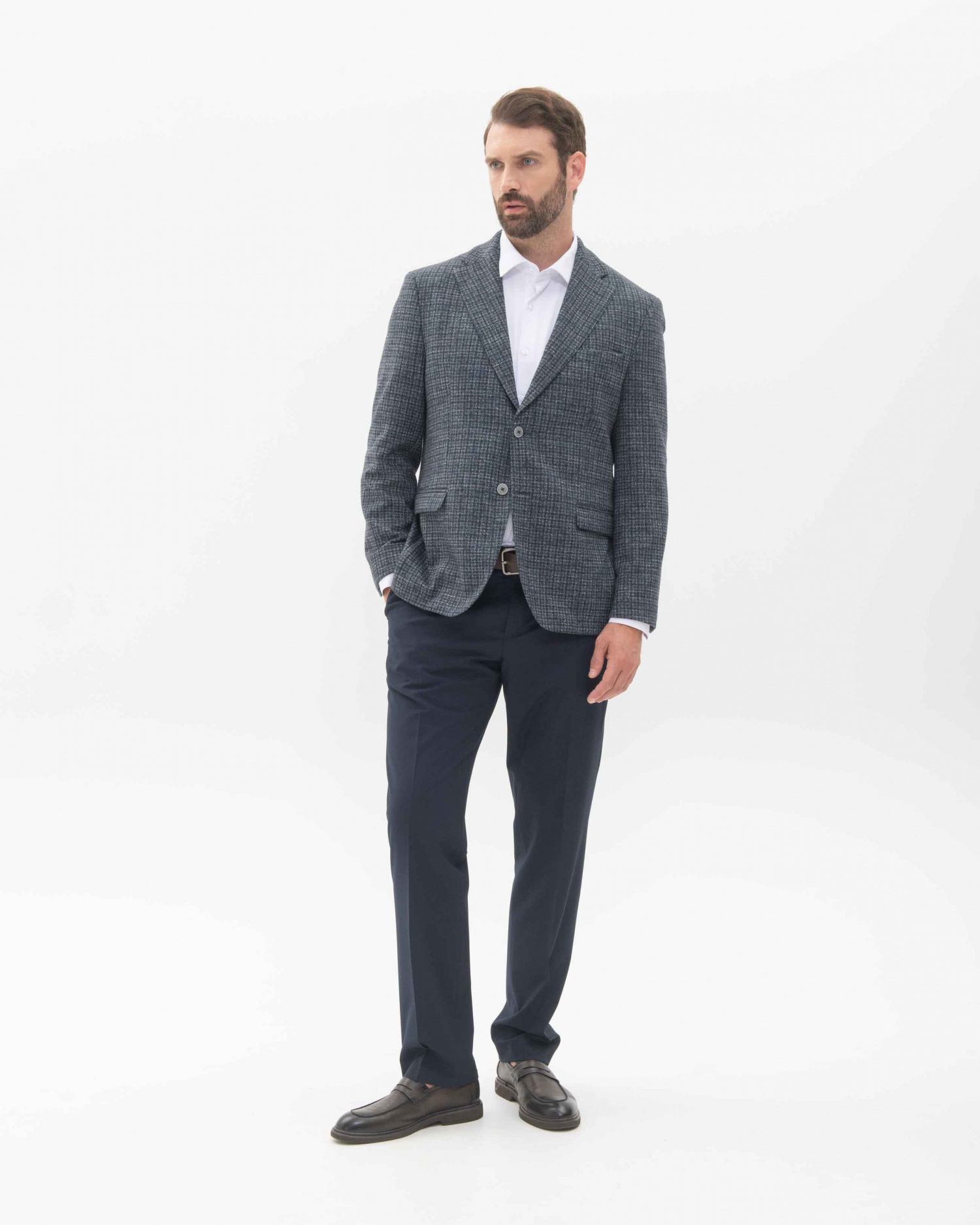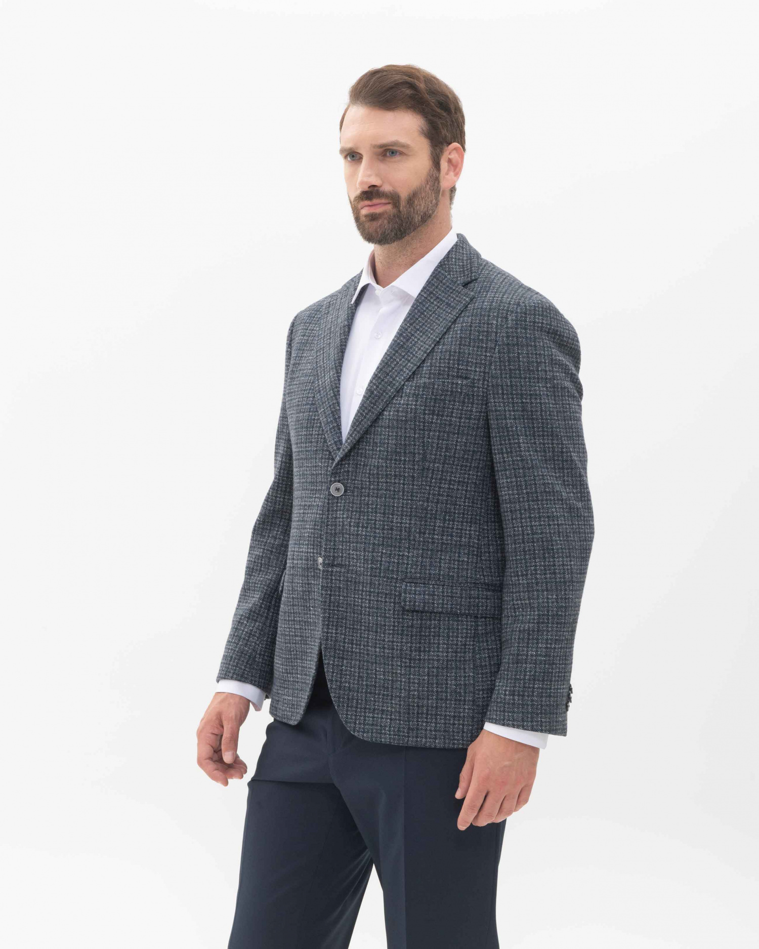 Пиджак с интересным рисунком из нескольких цветов - синий, серый с вкраплениями белого, универсален. Его можно сочетать как с классическим стилем, так и с повседневным. За пиджаком легко ухаживать, так как он  состоит  из 25% шерсти, 70% полиэстер, 5% эластана